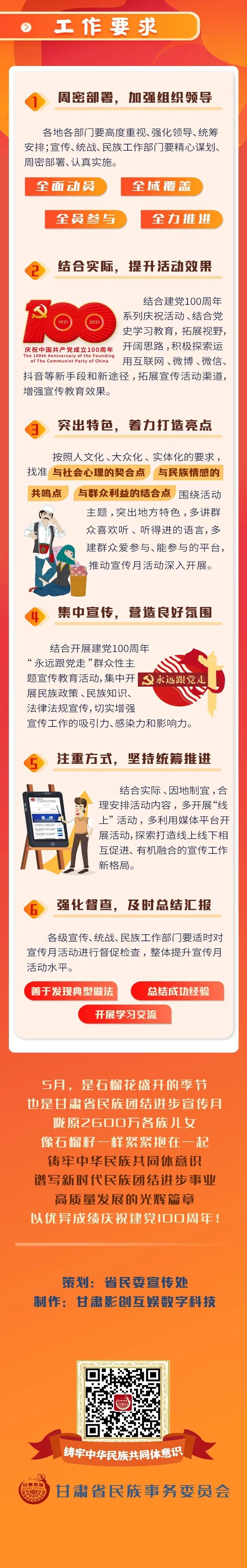 5月,是石榴花盛開的季節,也是甘肅省民族團結進步宣傳月,隴原2600萬各族兒女像石榴籽一樣緊緊抱在一起,鑄牢中華民族共同體意識,譜寫新時代民族團結進步事業高質量發展的光輝篇章,以優異成績慶祝建黨100周年!