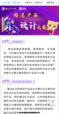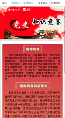 近期,我校易班發(fā)展中心推出“黨史知識(shí)競賽”“周邊產(chǎn)品設(shè)計(jì)大賽”“春季攝影大賽”“重溫黨史,‘易’起感悟”“百年光輝,‘易’起來畫”“紅色地點(diǎn)游”等系列活動(dòng),制作“五一勞動(dòng)節(jié)”“易起看校運(yùn)”等多個(gè)輕應(yīng)用。學(xué)生用蓬勃的朝氣共同迎接建黨百年,堅(jiān)定初心使命,爭做時(shí)代新青年。