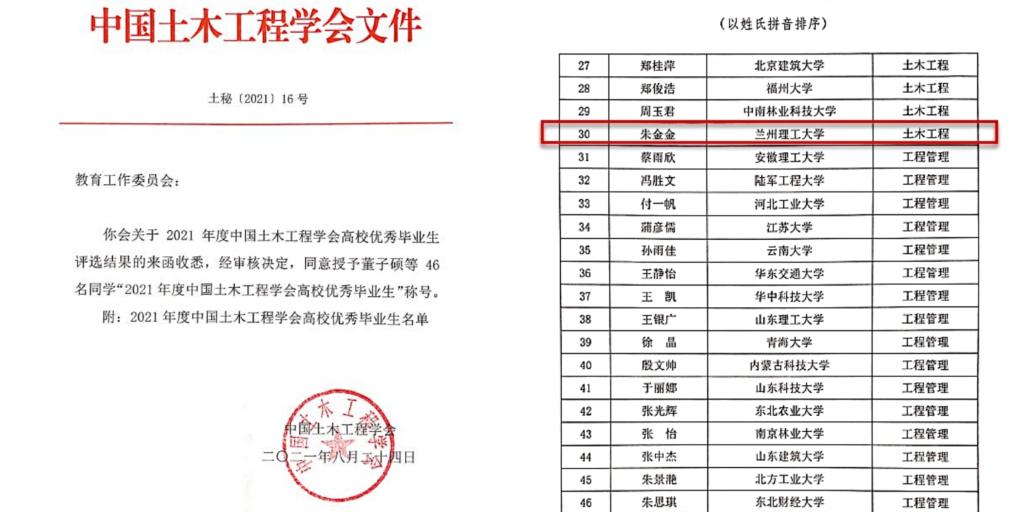 近日,從中國土木工程學會獲悉,我校2021屆土木工程專業畢業生朱金金獲得“2021年度中國土木工程學會高校優秀畢業生”榮譽稱號,這是評選該獎項以來,我校第15位同學榮獲該獎項。