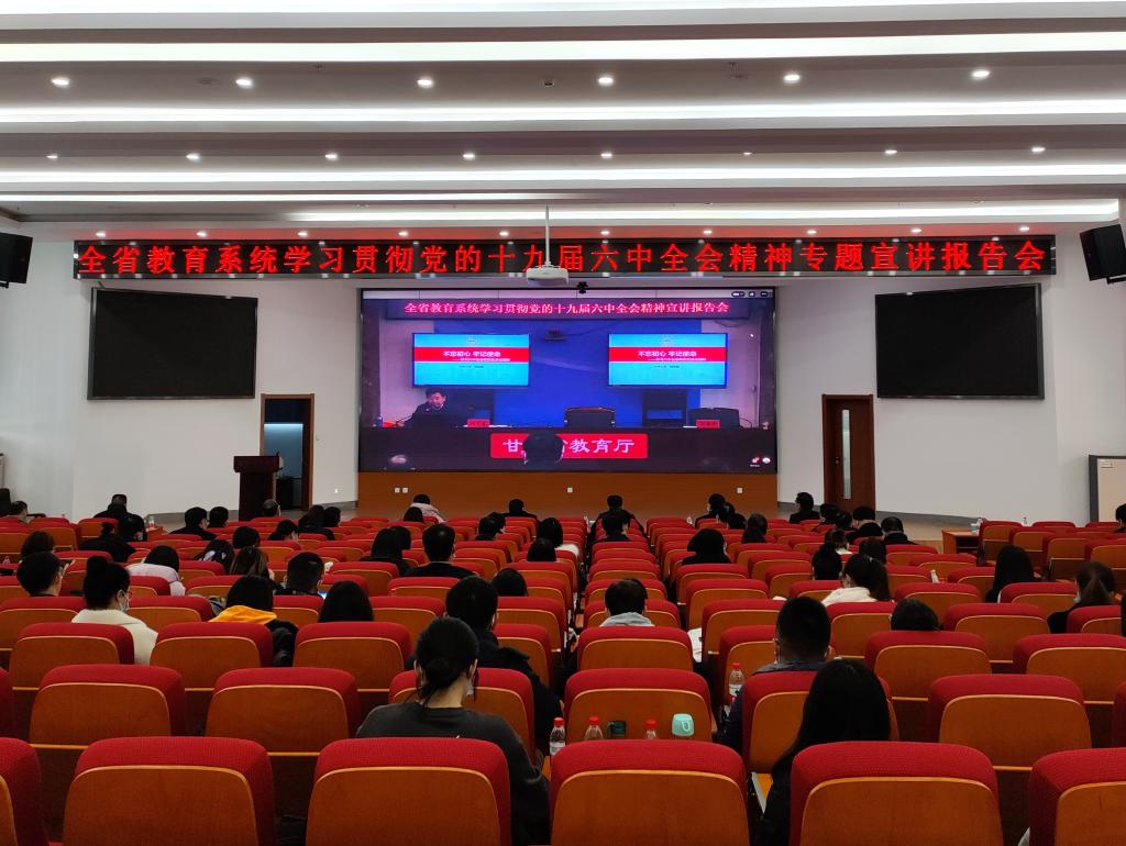 11月29日下午,全省教育系統學習宣傳貫徹黨的十九屆六中全會精神專題宣講報告會召開,蘭州大學馬克思主義學院教授劉先春作專題輔導,省委教育工委書記,省教育廳黨組書記、廳長王海燕主持會議并講話。