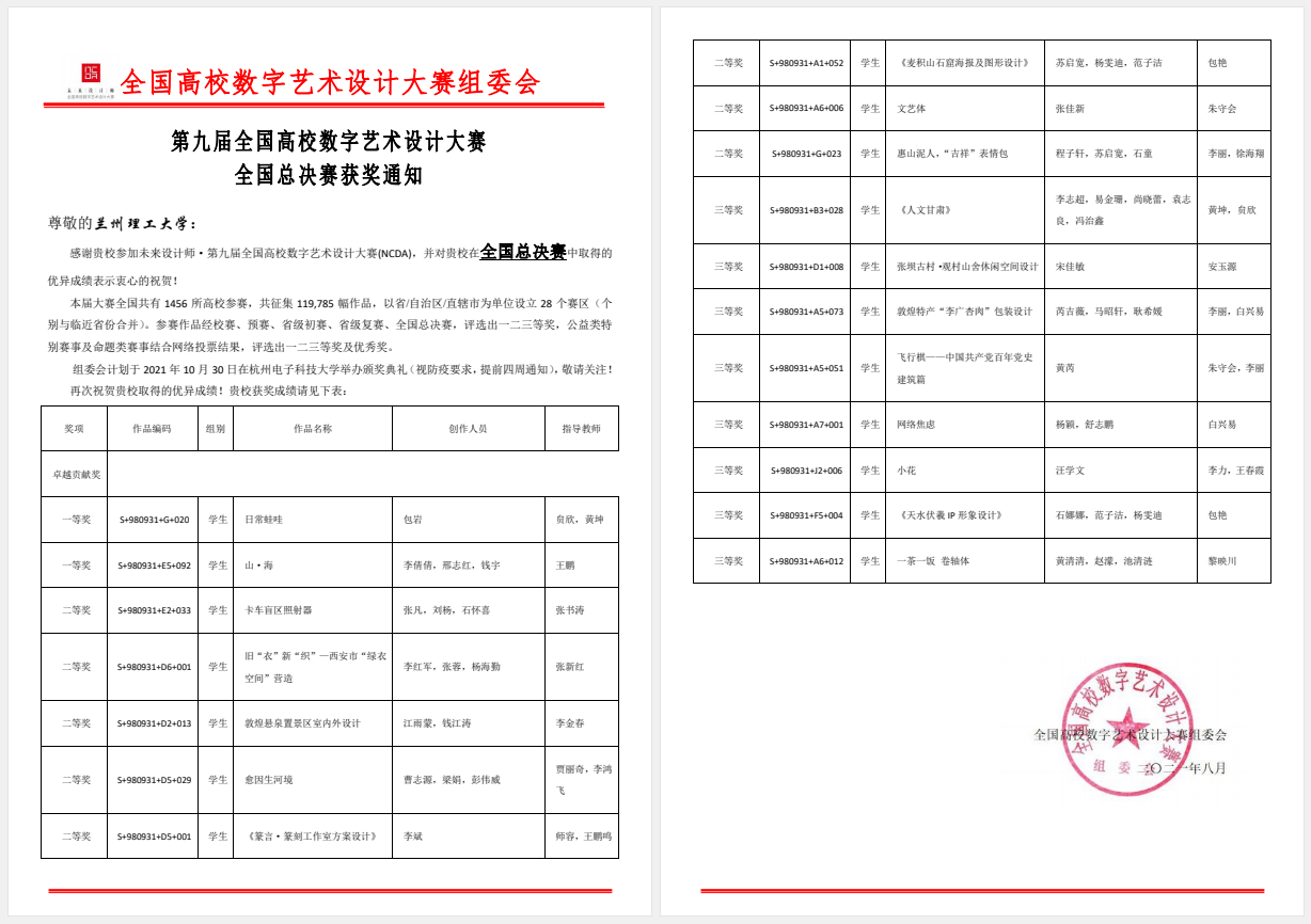 本屆大賽共有1456所高校參加,參賽作品近12萬幅。我校設計藝術學院在本屆賽事中榮獲佳績,共獲得國家級一等獎2項、二等獎8項、國家級三等獎8項。學院在學校創新創業學院等部門的組織協調下,負責承辦了甘肅賽區的具體參賽事宜,得到了全國組委會和兄弟院校的高度肯定,學校在團體組織獎中獲得“卓越貢獻獎”,甘肅賽區獲評“優秀賽區”。