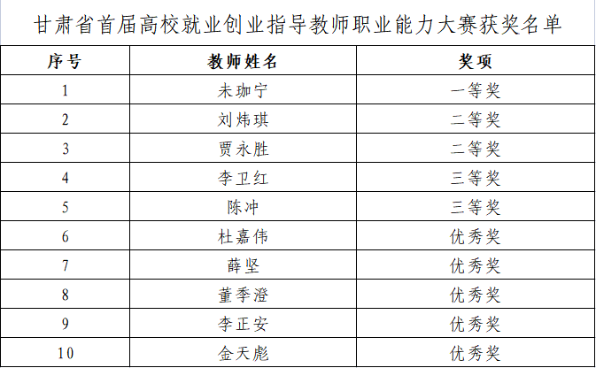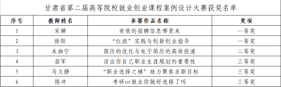 近日,由教育部高校學生司指導、甘肅省教育廳主辦的“中鐵二十一局杯”第二屆甘肅省大學生就業創業大賽暨第二屆沿黃五省(區)大學生就業創業大賽甘肅選拔賽以及內容涵蓋甘肅省首屆就業創業指導教師職業能力大賽、甘肅省第二屆高等院校就業創業課程案例設計大賽、甘肅省第二屆高校畢業生就業創業故事征文大賽的系列就業創業活動圓滿落下帷幕。學校在此系列大賽中取得優異成績,共獲一等獎6項、二等獎18項、三等獎14項、優秀獎5項,并榮獲省教育廳就業創業系列活動及第二屆甘肅省大學生就業創業大賽兩大主題活動的“優秀組織獎”。