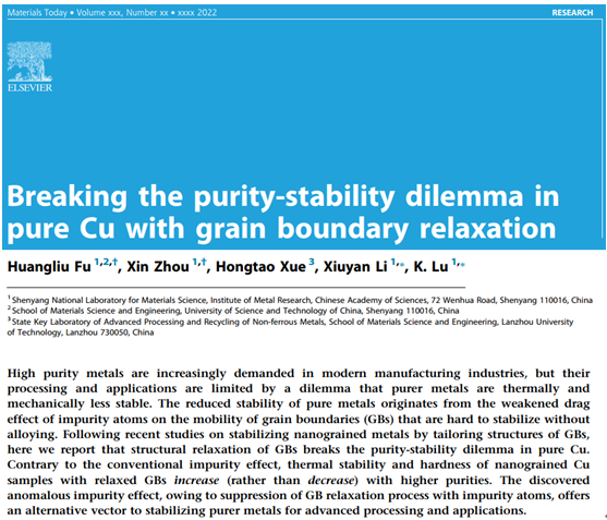 近期,蘭州理工大學省部共建有色金屬先進加工與再利用國家重點實驗室薛紅濤副研究員與中科院金屬所沈陽材料科學國家研究中心盧柯院士團隊合作的原創(chuàng)性研究成果“Breaking the purity-stability dilemma in pure Cu with grain boundary relaxation”在國際材料科學領(lǐng)域頂級期刊《MaterialsToday》(影響因子IF=31.041)在線發(fā)表。該研究工作是由國家重點實驗室與沈陽材料科學國家研究中心合作完成,薛紅濤博士為第三作者,參與完成了該成果中分子動力學模擬的研究工作,通訊作者為沈陽材料科學國家研究中心主任盧柯院士和我校柔性引進專家李秀艷研究員。