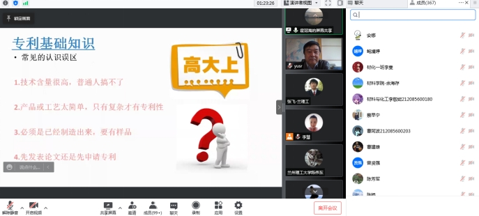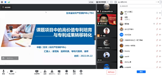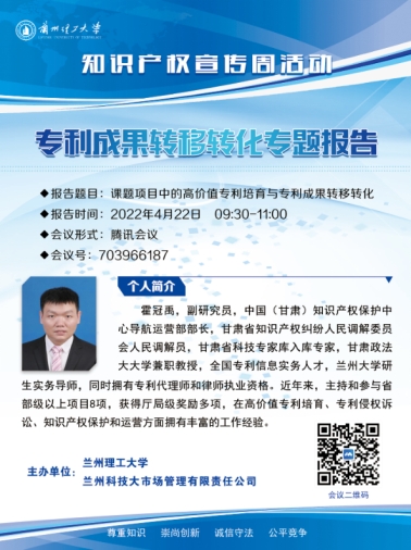 4月22日上午,作為“蘭州理工大學2022年度知識產權宣傳周”的重要活動,學校與蘭州科技大市場共同邀請甘肅省知識產權保護中心霍冠禹副研究員為全校師生做題為“課題項目中的高價值專利培育與專利成果轉移轉化”的線上專題報告。學校黨委常委、副校長俞樹榮,各學院(科研機構)科研負責人,及全校科研人員、博士研究生360余人參加報告,報告會由科技處副處長張飛主持。