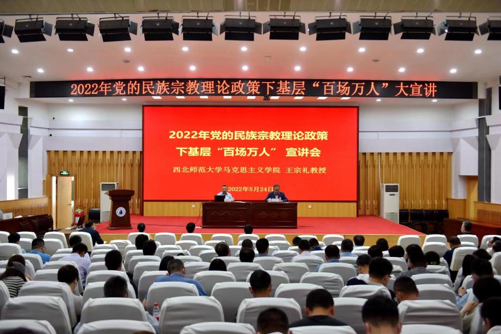 5月24日,學校舉辦2022年黨的民族宗教理論政策下基層“百場萬人”大宣講活動。西北師范大學馬克思主義學院原院長、博士生導師王宗禮教授應邀作輔導報告。省委統戰部十二處副處長李勝利,學校校級領導,全體中層干部和輔導員,馬克思主義學院教師代表參加了宣講活動。黨委常委、副校長、黨委統戰部部長宋琦主持宣講活動。