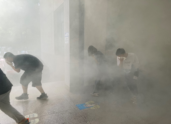 本次活動(dòng)由三個(gè)階段組成,第一階段邀請(qǐng)消防宣傳中心教官結(jié)合近幾年的火災(zāi)案例為大家講解消防安全的重要性及基本的消防安全知識(shí);第二階段使用消防煙霧彈模擬火災(zāi)現(xiàn)場(chǎng),組織學(xué)生進(jìn)行疏散逃生演練,消防宣傳中心教官指引學(xué)生按照指定路線,彎腰、低頭,用毛巾等捂住口鼻迅速有序地緊急疏散;第三階段為滅火實(shí)戰(zhàn)演練,消防科工作人員現(xiàn)場(chǎng)講解滅火器的使用方法,并指導(dǎo)學(xué)生進(jìn)行滅火實(shí)戰(zhàn)演練。