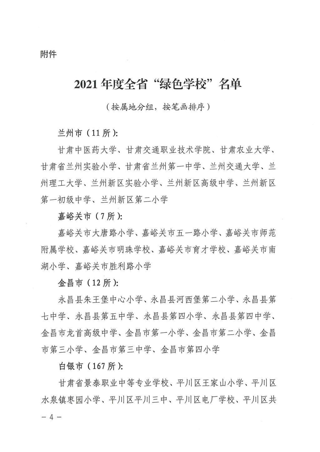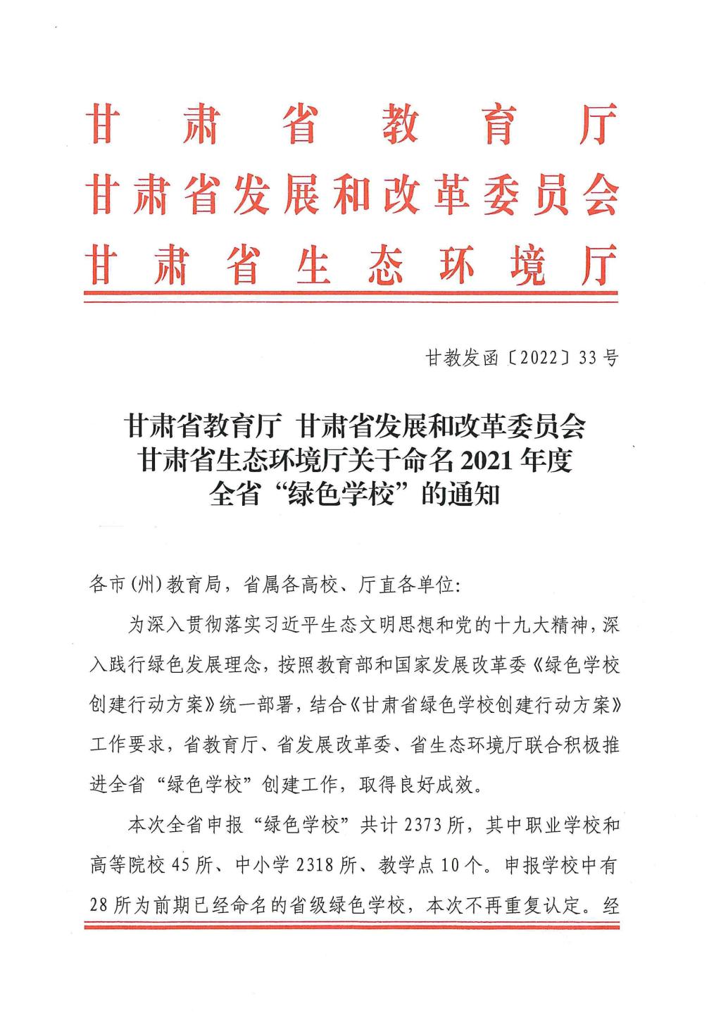 近日,省教育廳、省發展和改革委、省生態環境廳聯合發文,發布了命名2021年度全省“綠色學校”的通知,我校成功獲得首批甘肅省“綠色學校”命名。