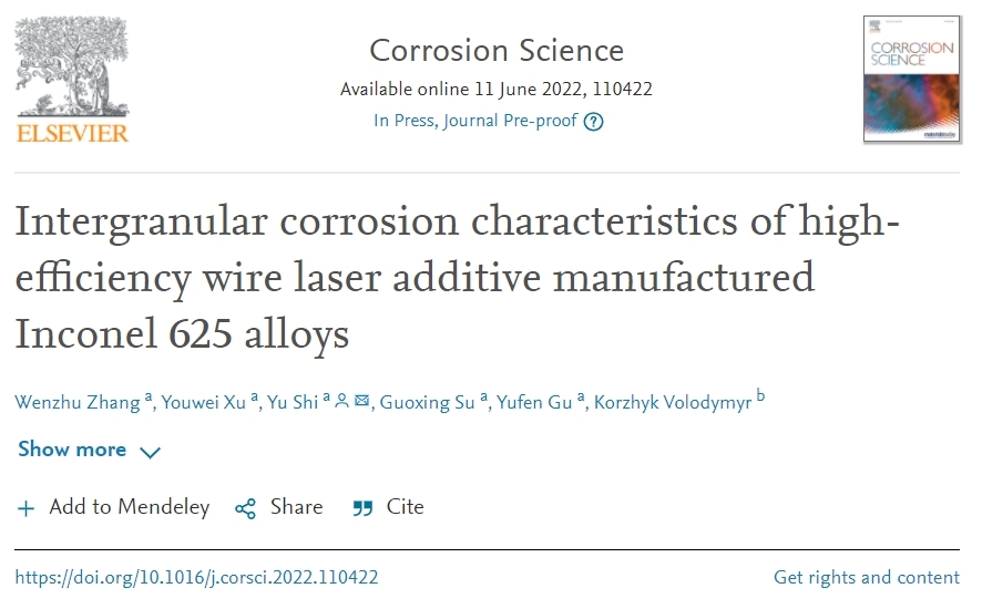 近期,省部共建有色金屬先進加工與再利用國家重點實驗室石玗教授團隊在激光增材制造方面取得重要進展,并以題為《Intergranular corrosion characteristics of high-efficiency wire laser additive manufactured Inconel 625 alloys》發表在國際腐蝕科學領域TOP期刊Corrosion Science(影響因?7.205)上。該研究工作由國家重點實驗室與浙江巴頓焊接技術研究院合作完成,第一作者為博士研究生張文著,指導老師為許有偉講師和石玗教授。