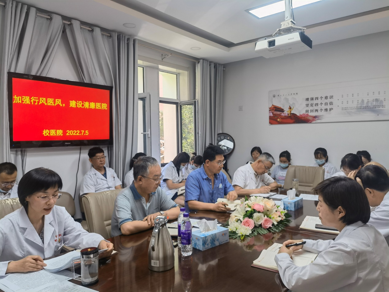 7月5日下午,校醫院召開支部理論中心組(擴大)學習研討會和“加強行風醫風,建設清廉醫院”動員安排會。校醫院全體黨員、業務科室負責人、護理組長、工會委員、公衛科及院辦管理崗位工作人員參加會議。會議由校醫院直屬黨支部書記張思成主持,黨委常委、副校長宋琦參加會議并指導工作。