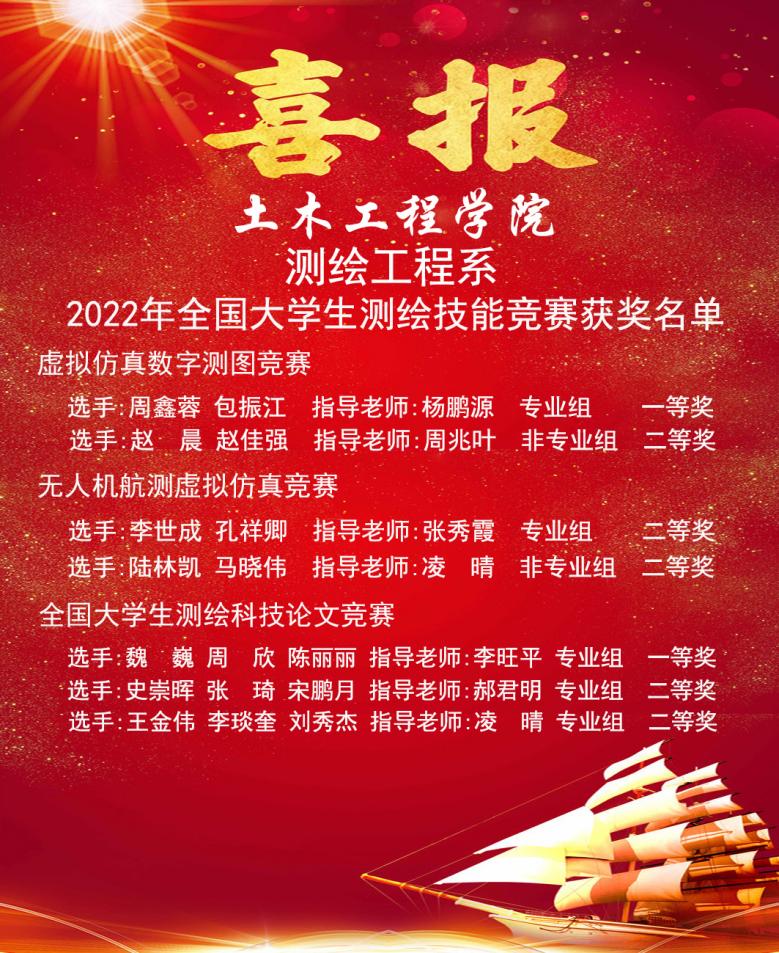 全國大學生測繪系列大賽主要面向國家測繪行業人才培養需求,已經成為創新創業教育的重要平臺和廣大測繪師生展示風采、追逐圓夢的廣闊舞臺。我校測繪工程系在接到比賽通知后,在學院指導下進行精心組織和部署,積極動員指導老師組織學生備賽。經過校內選拔賽和全國的預賽,共選拔出13組29名學生參加全國大學生測繪系列大賽決賽,經過激烈的角逐,共斬獲測繪技能大賽三類賽項7個獎項的優異成績,不僅充分展示了我校測繪學生的風采,也體現了我校測繪工程專業創新能力培養水平,為學校爭得榮譽的同時,進一步擴大了學科影響力。(撰稿:李旺平;審核:陳永泰)