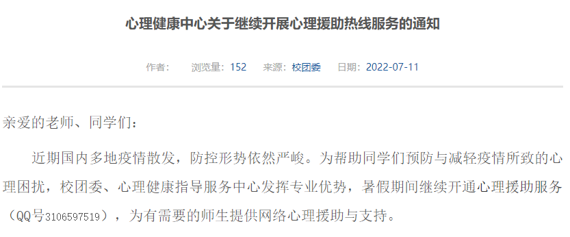 開通心理援助熱線,加強心理疏導。校團委、心理健康指導服務中心發(fā)揮專業(yè)優(yōu)勢,于7月10日起開通心理援助熱線,面向全體學生開展心理疏導,同時提供全國知名的心理援助熱線資源,幫助同學們預防與減輕疫情所致的困擾。此外,及時與學院心理輔導站溝通,對留校學生中的重點關注學生定期進行心理疏導和幫扶,確保他們平穩(wěn)度過疫情。