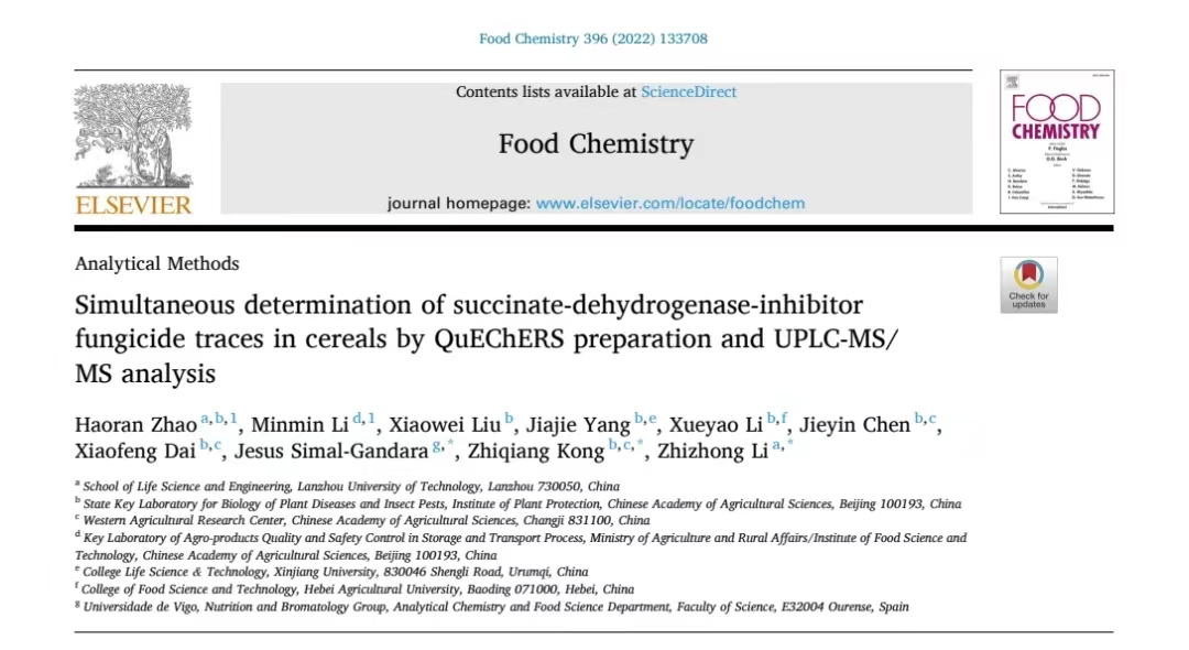 近日,由我校生命科學與工程學院李志忠教授、2020級碩士研究生趙浩然完成的題為“Simultaneous determination of succinate-dehydrogenase-inhibitor fungicide traces in cereals by QuEChERS preparation and UPLC-MS/MS analysis”的最新科研成果在食品科技領域TOP期刊Food Chemistry(JCR 1區,IF:9.231)上發表,中國農業科學院植物保護研究所、國家中藥材產業技術體系質量與品質綜合評價崗團隊成員孔志強副研究員,西班牙維戈大學Jesus Simal-Gandara教授在實驗方面給與了指導和幫助。