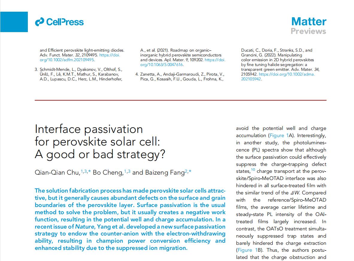 2022年8月,省部共建有色金屬先進加工與再利用國家重點實驗室和材料科學與工程學院楚倩倩、成波博士等以“Interface passivation for perovskite solar cell: A good or bad strategy?”為題,在中科院一區期刊《Matter》(IF=19.967)上發表鈣鈦礦光伏領域發表重要評述論文。《Matter》是《Cell》期刊的姊妹刊,是材料、化學類享有盛譽的國際權威期刊。