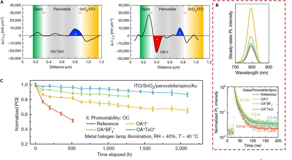 鈣鈦礦太陽能電池作為新一代的光伏技術,2013年被美國《科學》雜志評為年度十大科學突破,其以高功率的轉換效率、優異的光電性能和調節透明度和顏色的合成多功能性收到世界各國的熱捧,在短短十多年的時間里,以高光學吸收系數,低激子結合能,長距離載流子擴散長度的有機-無機金屬鹵化物鈣鈦礦為光吸收層的太陽能電池(PSC)的能量轉換效率從最初的3.8%躍升至如今的25%以上。同時,PSC低溫溶液法制備工藝大幅度降低了制備成本,展現了商業化的巨大潛力。但是低溫溶液法制備會引起鈣鈦礦層的表面和晶界存在大量缺陷。表面鈍化是解決這一問題的常用方法,但它通常會產生負功函數,導致電位阱和電荷積聚。本文討論了一種新的表面鈍化策略,賦予陰離子吸電子的能力,優化能級;進而抑制了離子遷移,實現了PSC器件功率轉換效率和穩定性的協同提升。