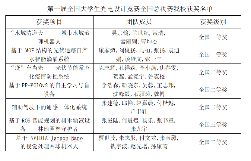 由中國光學學會主辦、全國大學生光電設計競賽委員會具體負責、華中科技大學承辦的第十屆全國大學生光電設計競賽決賽于2022年8月25-26日 在華中科技大學以線上創新賽的形式圓滿落幕。 全國共有來自351所高校的2768個項目、17364名師生報名參加本屆競賽。經過前期華北、東北、西北、西南、 中部、東南和東部七個分賽區選拔,最終有來自154所高校的337個支參賽隊、2538名師生進入全國賽。我校獲得國家一等獎1項、二等獎4項、三等獎2項的好成績,并被評為優秀組織單位。