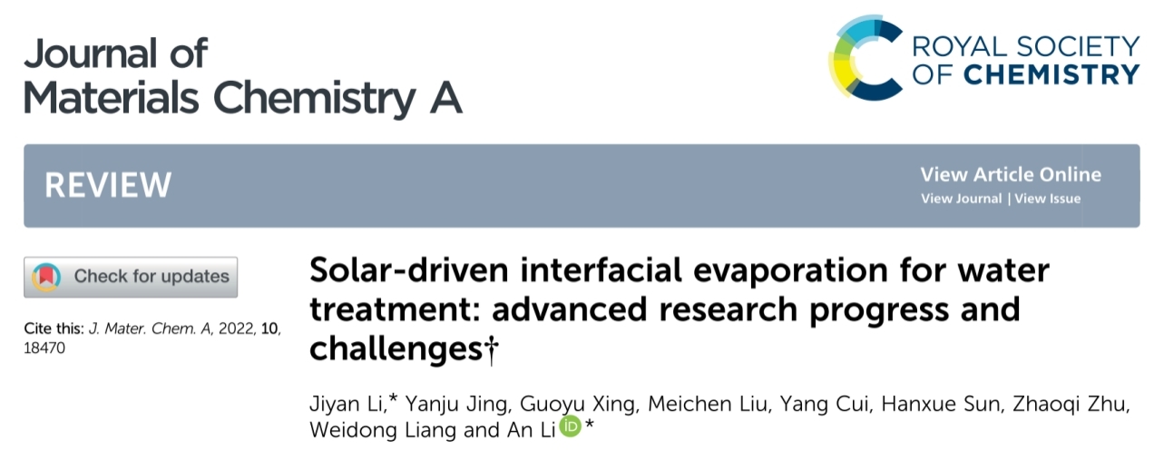 近日,石油化工學院李安研究員、梁衛東教授為負責人的“先進微納孔材料設計及應用”課題組,在材料科學領域TOP期刊《Journal of Materials Chemistry A》(JCR:Q1;影響因子:14.511)發表題為“Solar-Driven Interfacial Evaporation for Water Treatment: Advanced Research Progress and Challenges”的太陽能驅動光熱界面蒸發研究綜述論文(論文鏈接:https://doi.org/10.1039/D2TA03321F),課題組成員、青年教師李吉焱為論文第一作者,李安、李吉焱為論文通訊作者。本論文是該課題組受邀在太陽能研究領域《Solar RRL》期刊發表綜述性文章“Recent Progress on the Solar-Driven Interfacial Evaporation Based on Natural Products and Synthetic Polymers(Solar RRL, 2021, 5, 2100475)”后的又一篇高水平綜述論文。
