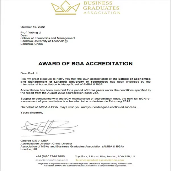 2022年10月11日,經(jīng)濟(jì)管理學(xué)院收到英國(guó)商學(xué)院畢業(yè)生協(xié)會(huì)(Business Graduates Association,簡(jiǎn)稱BGA)的官方賀信,祝賀學(xué)院正式通過(guò)BGA金牌認(rèn)證,我校成為中國(guó)西北地區(qū)首個(gè)通過(guò)BGA單獨(dú)認(rèn)證的院校。