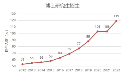 不斷加強(qiáng)招生宣傳,積極提升學(xué)校影響力,研究生報(bào)考和錄取人數(shù)快速增長。2022級(jí)研究生報(bào)考人數(shù)6769人,較2012年增長371%;錄取博士119人,較2012年增長126%;錄取碩士2637人,較2012年增長142%。2022年錄取博士中,“本科直博”“碩博連讀”“申請(qǐng)-考核制”占比71%;錄取碩士中,優(yōu)質(zhì)生源占比69%,專業(yè)學(xué)位研究生達(dá)到61%,研究生與本科生當(dāng)年招生比達(dá)到1:2。目前研究生規(guī)模8019人,較2012年增長155%。