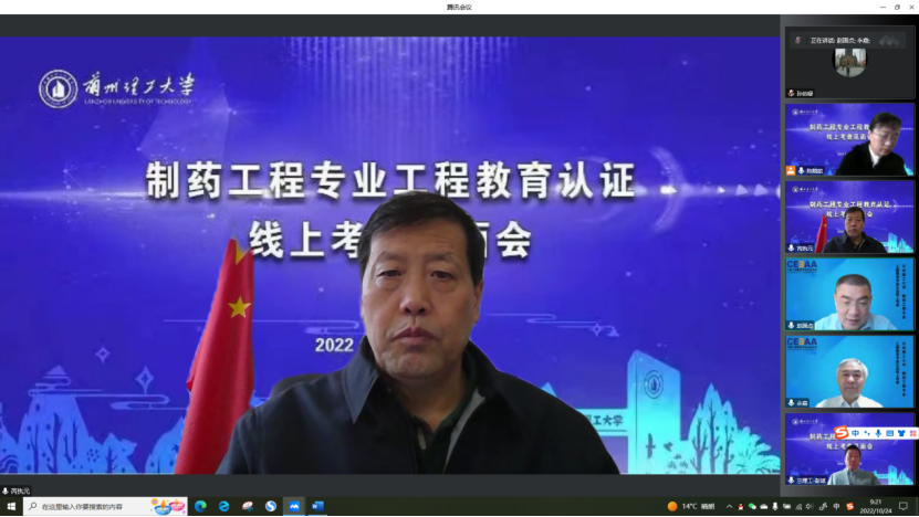 10月24日上午,蘭州理工大學(xué)制藥工程專業(yè)工程教育認(rèn)證考查見面會(huì)通過騰訊會(huì)議在線上召開。專家組組長(zhǎng)華東理工大學(xué)沈永嘉教授,專家組成員武漢工程大學(xué)張珩教授,安徽豐原藥業(yè)股份有限公司尹雙青教授級(jí)高工,天津理工大學(xué)陳寶泉正高級(jí)工程師,專家組秘書太原理工大學(xué)趙國(guó)貞副教授,學(xué)校黨委副書記、校長(zhǎng)芮執(zhí)元,副校長(zhǎng)李仁年,黨委常委、副校長(zhǎng)王全進(jìn)出席會(huì)議。教務(wù)處、人事處、財(cái)務(wù)處、學(xué)生處、實(shí)管處等相關(guān)職能部門主要負(fù)責(zé)人,生命科學(xué)與工程學(xué)院全體院領(lǐng)導(dǎo)、專業(yè)負(fù)責(zé)人及專業(yè)全體教師參加會(huì)議。會(huì)議由王全進(jìn)與專家組組長(zhǎng)沈永嘉分階段主持。