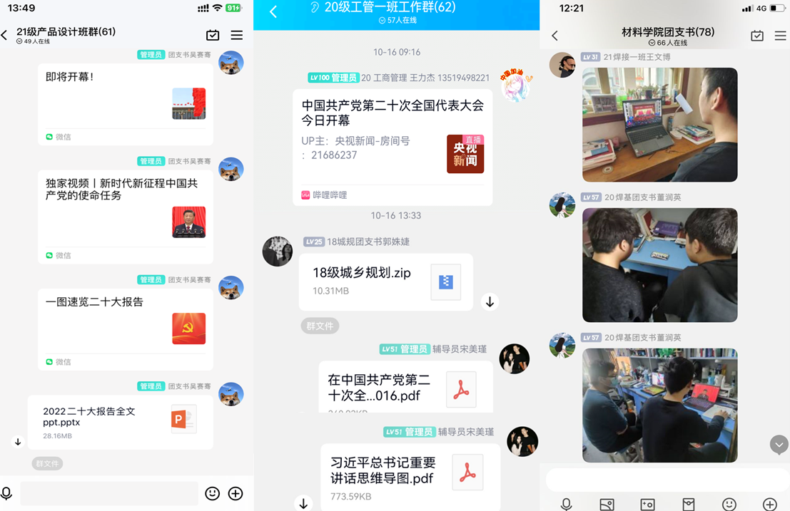 團(tuán)支部充分利用“學(xué)習(xí)強(qiáng)國(guó)”“青年大學(xué)習(xí)”等學(xué)習(xí)平臺(tái),及時(shí)在支部微信群、QQ群發(fā)布黨的二十大精神相關(guān)信息,黨的二十大報(bào)告全文、報(bào)告學(xué)習(xí)手賬、報(bào)告思維導(dǎo)圖、黨的二十大報(bào)告是如何誕生的、《中國(guó)共產(chǎn)黨章程》等最新、最權(quán)威的內(nèi)容源源不斷地傳達(dá)給同學(xué)們,積極引導(dǎo)支部成員對(duì)黨的二十大精神不斷學(xué)習(xí)、領(lǐng)會(huì)、深化,促進(jìn)黨的二十大精神在團(tuán)員心中落地生根。