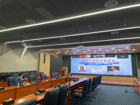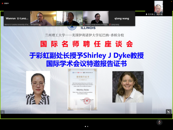 吳志強處長代表省級國際科技合作基地上級主管部門向Spencer院士線上頒發了擔任蘭州理工大學省減隔震國際合作基地第二屆學術委員會主任的聘書,并就減隔震國際合作基地下一階段的工作給我校防震減災研究團隊提出了要求。于彩虹調研員向另一位報告人、美國普渡大學教授社麗﹒戴克(Shirley JDyke)博士線上頒發了本次國際學術報告會邀請報告證書。