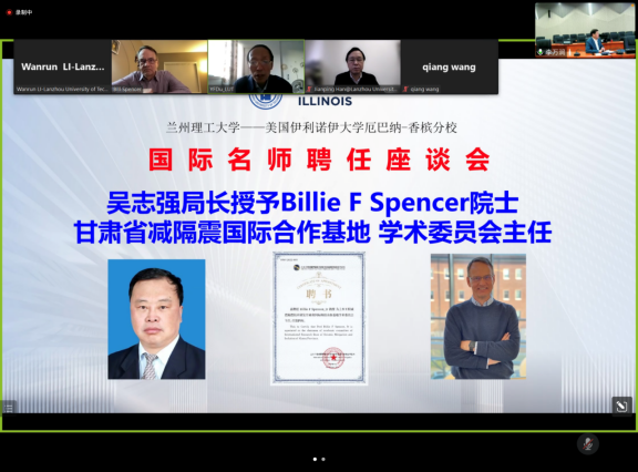 11月24日,在我校承辦的甘肅省土木建筑2022年國際學術報告會召開之前,蘭州理工大學校長芮執元教授線上會見了中國工程院外籍院士、美國伊利諾伊大學尚佩恩校區(UIUC)土木工程首席教授比爾﹒斯本瑟(Billie F Spencer,Jr)教授,并出席國際名師聘任座談會。甘肅省科學技術廳二級巡視員、國際合作處吳志強處長,國際合作處一級調研員于彩虹副處長和我校土木工程減震隔震技術研發甘肅省國際科技合作基地管理團隊部分骨干成員陪同會見。