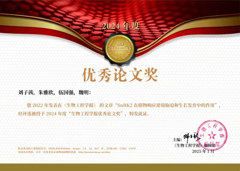 2025年1月,《生物工程學(xué)報(bào)》編輯部對(duì)2022年度發(fā)表在《生物工程學(xué)報(bào)》的論文進(jìn)行了回溯和評(píng)估,根據(jù)中國(guó)知網(wǎng)CNKI、中國(guó)科學(xué)引文數(shù)據(jù)庫(kù)CSCD等數(shù)據(jù)庫(kù)中的被引頻次(數(shù)據(jù)截止2025-01-17)以及論文的創(chuàng)新性(專家評(píng)審意見),綜合評(píng)選出26篇優(yōu)秀論文,授予2024年度“生物工程學(xué)報(bào)優(yōu)秀論文獎(jiǎng)”,并頒發(fā)獲獎(jiǎng)證書。我校生命科學(xué)與工程學(xué)院植物逆境生理與基因工程課題組在《生物工程學(xué)報(bào)》2022年38卷1期發(fā)表的文章“SnRK2在植物響應(yīng)逆境脅迫和生長(zhǎng)發(fā)育中的作用”獲獎(jiǎng)。該論文第一作者是2022屆生物工程碩士研究生劉子茜同學(xué),通訊作者為伍國(guó)強(qiáng)教授。