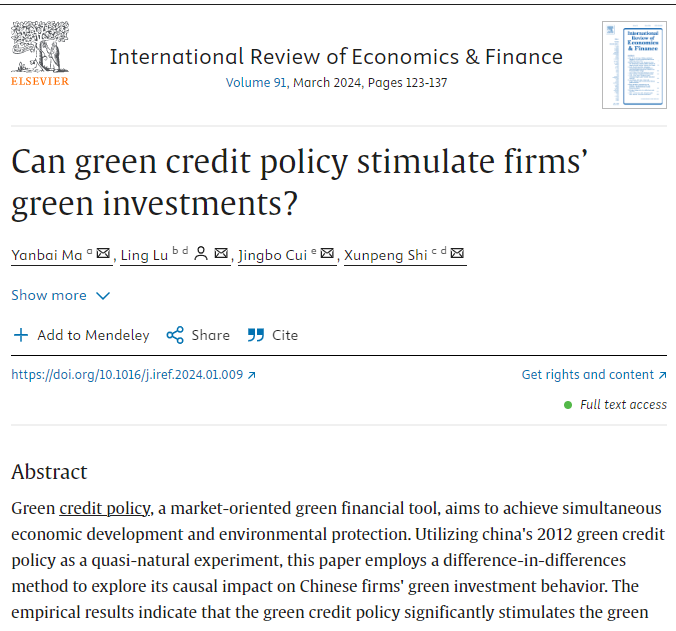 該論文以中國(guó)2012年綠色信貸政策為準(zhǔn)自然實(shí)驗(yàn),采用雙重差分法探討其對(duì)中國(guó)企業(yè)綠色投資行為的影響。研究結(jié)果表明,與非污染密集型行業(yè)相比,綠色信貸政策顯著刺激了污染密集型行業(yè)的綠色投資,2018年對(duì)這一政策的補(bǔ)充條例強(qiáng)化了綠色投資的誘導(dǎo)效應(yīng)。這些發(fā)現(xiàn)揭示了綠色金融政策在促進(jìn)綠色復(fù)蘇中的關(guān)鍵作用,文章建議政府應(yīng)在數(shù)量和范圍上加強(qiáng)綠色信貸對(duì)經(jīng)濟(jì)轉(zhuǎn)型的支持。(圖/文:馬延柏;審核:張清輝)