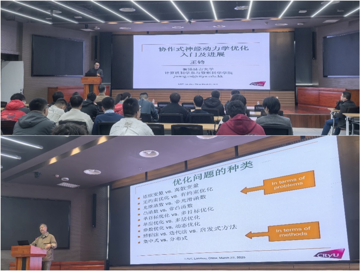 近日,電信學院自動化系攜手學院柔性引進專家蘭州大學金龍教授,特邀香港工程院院士、香港城市大學計算機科學系和數據科學學院計算智能講座教授王鈞教授,為我院師生帶來了一場題為《協作神經動力學優化的最新進展》的精彩學術報告。本次報告會由學院副院長李二超教授主持,吸引了學院百余名教師和研究生積極參與。