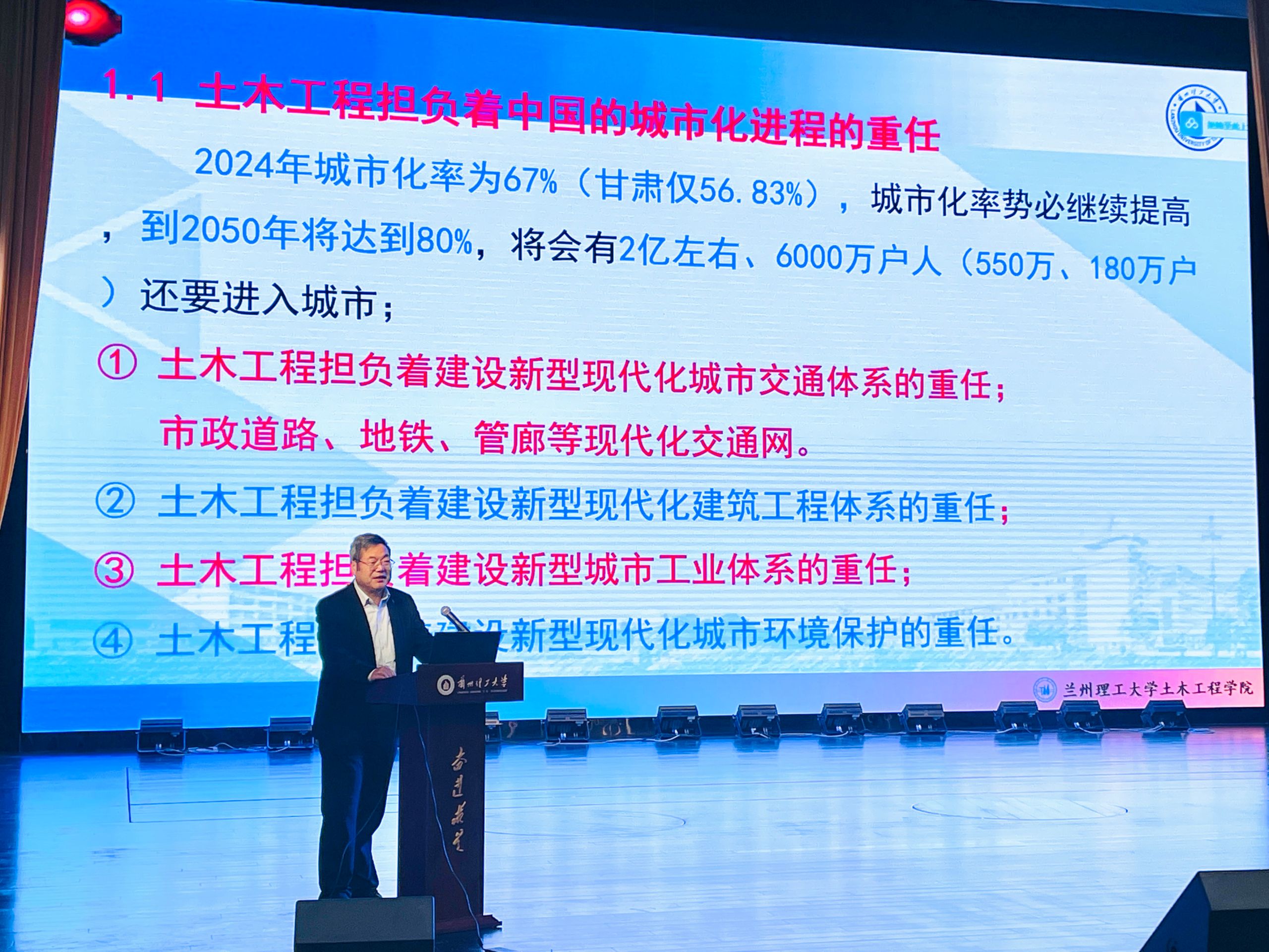 名師領航:共探土木工程發展藍圖。朱彥鵬教授以“土木工程的發展與挑戰”為主題,從學科歷史、行業前沿、國家戰略需求等多維度展開深度解讀。他談到土木工程在國家基礎設施建設中的支柱作用并結合“一帶一路”倡議、宜居韌性新型城鎮化建設等重大戰略,指出土木工程在推動區域經濟發展、改善民生福祉中的關鍵地位。針對未來發展,朱彥鵬教授聚焦綠色建筑、智能建造、防災減災等新興領域,通過港珠澳大橋、蘭州地鐵等典型案例,生動詮釋了數字化技術如何重塑行業格局。面對“雙碳”目標下的轉型挑戰,他鼓勵學生夯實專業基礎,培養跨學科思維,主動適應行業智能化、綠色化發展趨勢。