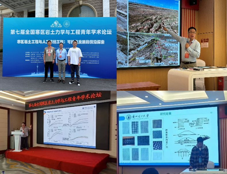 本屆會議圍繞主題“寒區巖土和人工凍結工程可持續發展前沿探索”,對寒區巖土工程、人工凍結工程中的新理論和新技術、環境變化與寒區工程的相互影響進行探討,推動寒區巖土工程的理論發展和安全建設。會議吸引了來自國內40余所科研單位的300余名師生參加,開展了18場主會場報告、96場分會場報告及50場研究生報告。周鳳璽、張明禮、何鵬飛分別做了題為《西北暖濕化環境下鹽漬土熱質遷移及變形特性研究》《坡面裂隙對多年凍土斜坡水熱狀態及熱融滑塌過程影響》《常法向剛度條件下凍土與復合土工布界面剪切》的報告,兩位研究生參加了研究生學術論壇,介紹了我校寒區巖土工程團隊的最新研究進展。