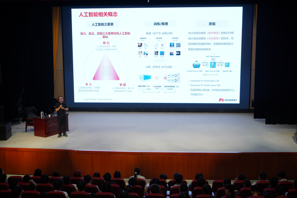 本次講座,賈鵬飛老師聚焦人工智能的全球發展趨勢、行業應用實踐以及未來面臨的挑戰,結合華為DeepSeek團隊的行業洞察,詳細介紹了人工智能領域關鍵技術的突破性成果、未來競爭格局、演進路徑和發展方向。他以華為人工智能解決方案為例,詳細講解了智能質檢、醫療影像分析、金融風險控制等應用場景,充分展現了人工智能技術在推動產業升級方面的強大動力。他鼓勵同學們夯實專業基礎,積極擁抱人工智能變革,努力成為新時代的科技先鋒。(圖/文:張國勇;審核:王文霞)