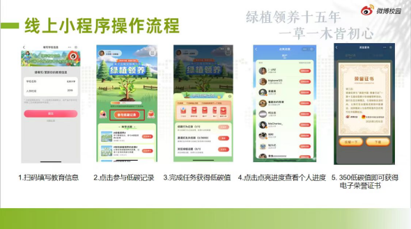 微博掃碼進(jìn)入小程序,填寫信息進(jìn)入活動(dòng)主頁,拍下我們的活動(dòng)并發(fā)微博記錄低碳生活即可在兩校區(qū)線下活動(dòng)現(xiàn)場領(lǐng)取綠植一盆,滿足350低碳值獲得電子低碳證書。