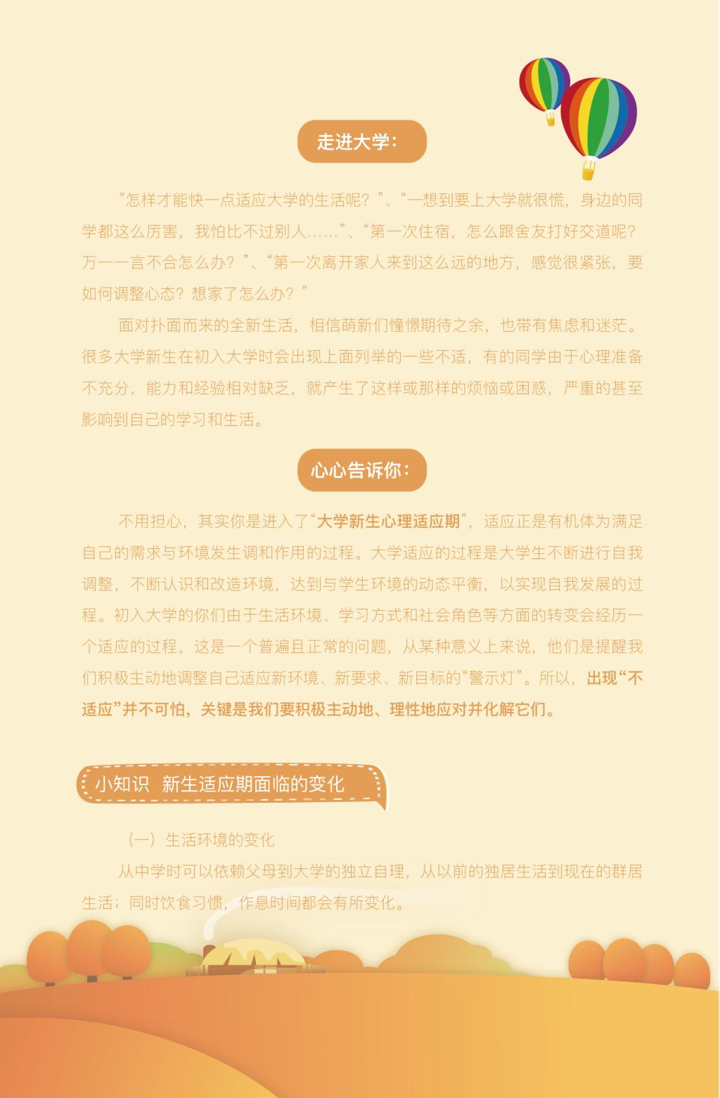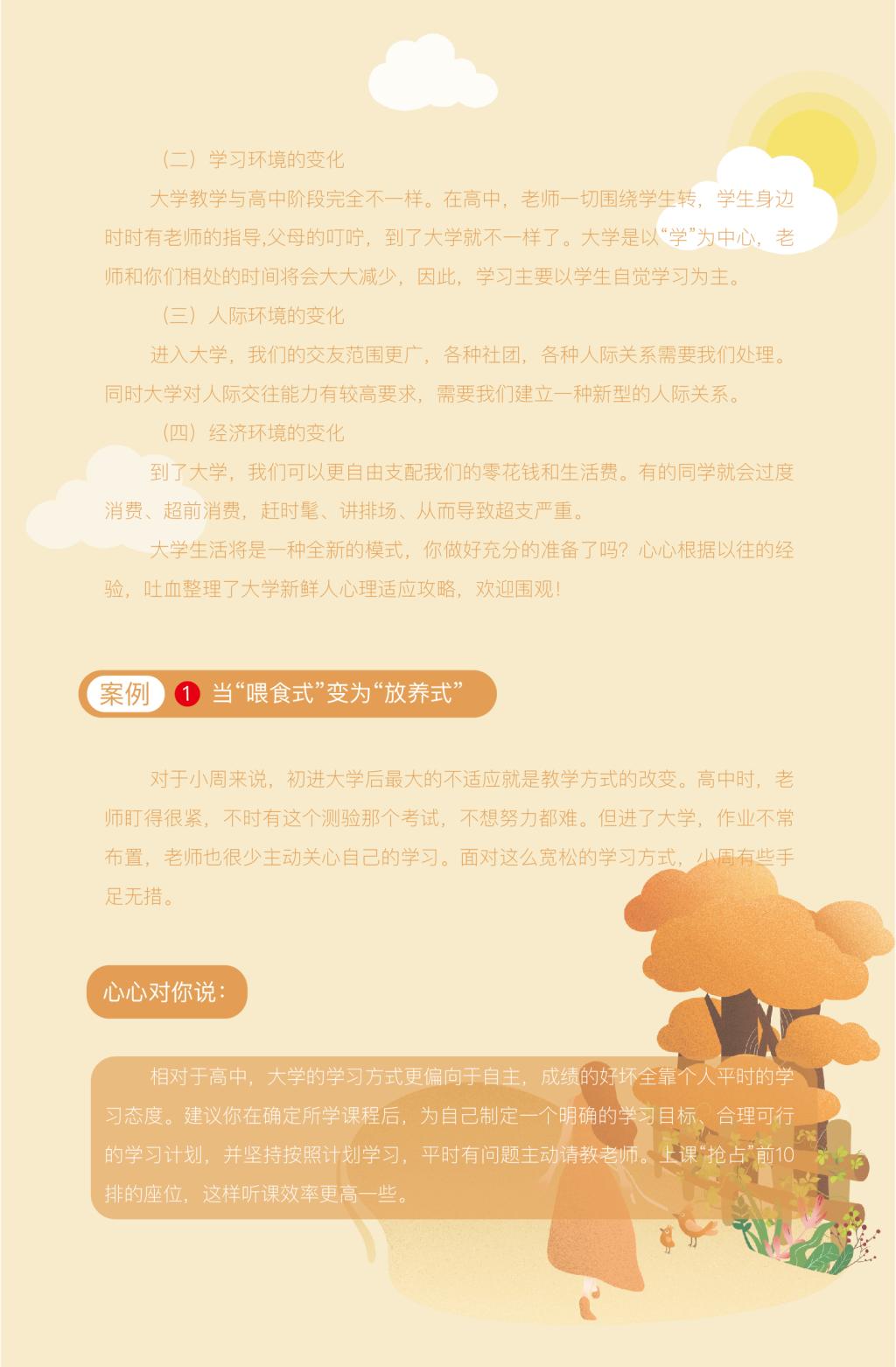 2020-09-14“怎樣才能快一點適應大學的生活呢?”、“一想到要上大學就很慌,身邊的同學都這么厲害,我怕比不過別人……”、“第一次住宿,怎么跟舍友打好交道呢?萬一一言不合怎么辦?”、“第一次離開家人來到這么遠的地方,感覺很緊張,要如何調整心態?想家了怎么辦?”面對撲面而來的全新生活,相信萌新們憧憬期待之余,也帶有焦慮和迷茫。很多大學新生在初入大學時會出現上面列舉的一些不適,別擔心,下面“心心”(心理健康指導服務中心)帶大家全面了解心理適應,為接下來新的生活做好準備。