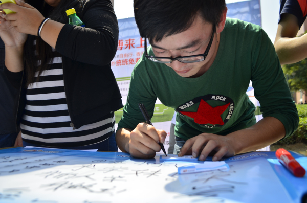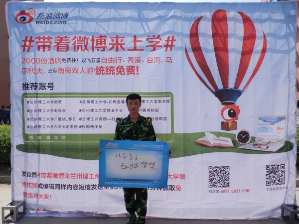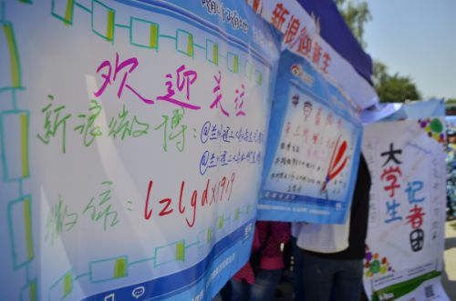 “曬出你的微博,小禮品帶回家。”由黨委宣傳部指導,大學生記者團、紅柳微博直播間、新浪微博主辦的微博迎新活動于9月11日在學校西校區南村大屏幕下火熱開展,為了引導新同學通過微博了解學校,增加情切感和歸屬感,以微博之力,隨時隨地分享大學美好時光。我校大學生記者團的同學們在藍綠迷彩之間開啟了微博之旅——“帶著微博來蘭理工”,新生老生互粉活動火熱開展。