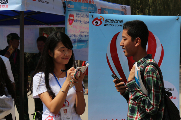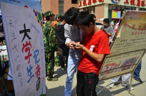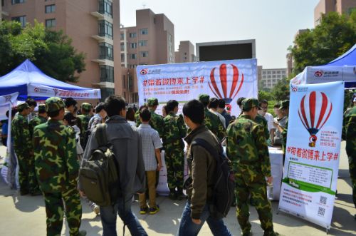軍訓休息之余的新生們參與活動,他們中很多人還沒有微博,在活動中很多人都拿起手機,開通微博,在微博上發出了自己初入校園的感受。
