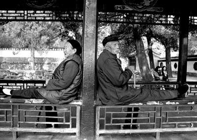 一起生活了幾十年,隔著柱廊休息,動作、神情都快一致了。