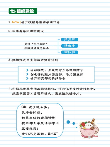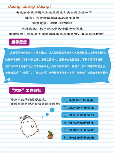 “作為小伙伴們的好‘盆’友,我的目標(biāo)絕對不僅僅是沒有蛀牙”、“為了更好地服務(wù)于大家的成長成才,我也是蠻拼的”,這些流行幽默的語言,配上活潑生動的卡通形象和小清新的畫面,不僅向同學(xué)們介紹了共青團工作的指導(dǎo)思想、“六新”工作目標(biāo)和“24字”工作理念,還從思想引領(lǐng)、學(xué)風(fēng)促建、校園文化、心理健康等7個方面,具體講述了團學(xué)特色活動和貼心服務(wù),讓同學(xué)們進一步認(rèn)識和理解共青團工作是在“干什么”,號召“紅柳青年”們參與到校園文化活動中來。