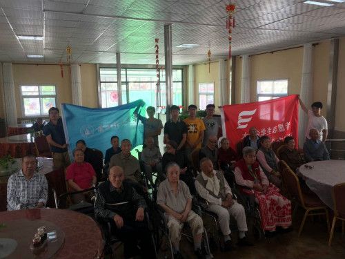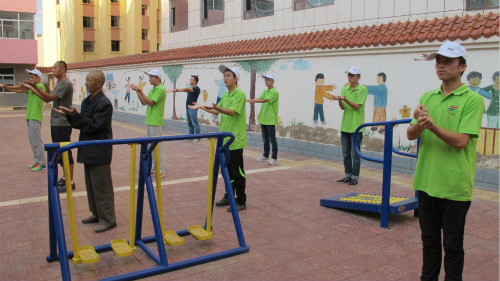 石化學(xué)院“紅色傳承,彩虹筑夢(mèng)”實(shí)踐服務(wù)團(tuán)與福利院老人一起晨練