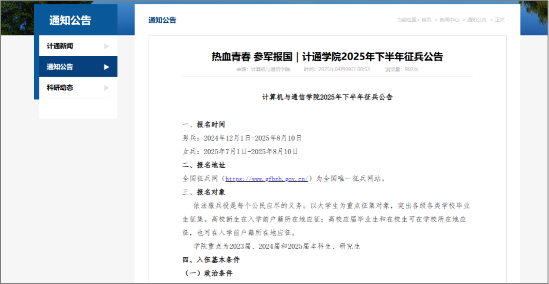 精準(zhǔn)推送,實現(xiàn)宣傳全覆蓋。學(xué)院通過官網(wǎng)發(fā)布《熱血青春參軍報國|計通學(xué)院2025年下半年征兵公告》,并依托班群、年級群等渠道進(jìn)行參軍信息推送,確保相關(guān)動態(tài)百分百觸達(dá)2025屆畢業(yè)生。針對2023屆、2024屆省內(nèi)生源適齡男生校友,通過郵箱、短信及校友QQ群定向推送參軍信息,擴(kuò)大信息覆蓋面。