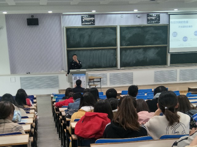 朱警官通過鮮活的案例、妙趣的語言向同學們介紹了電信詐騙的概念以及冒充公安詐騙、中獎詐騙、偽基站短信詐騙、冒充熟人微信、QQ進行詐騙、刷單詐騙、網絡購物詐騙、機票詐騙、冒充客服詐騙、冒充軍人詐騙、網絡招嫖詐騙、辦理信用卡被騙、網上貸款被騙共十種常見電信詐騙方式。他用幽默詼諧的方式對詐騙過程以及對受害人進行心理分析,告誡同學們遇事要沉著冷靜、不要貪圖小利,并提醒同學們在日常生活中收到陌生電話與短信時,不要輕易點擊鏈接與泄露個人信息以及發現問題時的緊急處置方式。