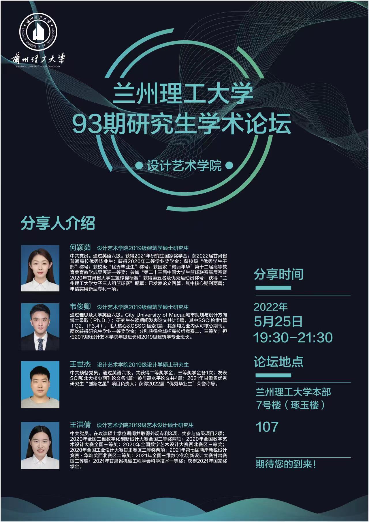 為拓寬學術視野,激發研究生潛心鉆研學術的熱情,促進學術交流,提高研究生綜合素質,設計藝術學院研究生會于2022年5月25日在琢玉樓107教室舉辦蘭州理工大學第93期研究生學術論壇。2019級何穎茹、韋俊卿、王世杰、王洪倩4位應屆優秀畢業生應邀參會。