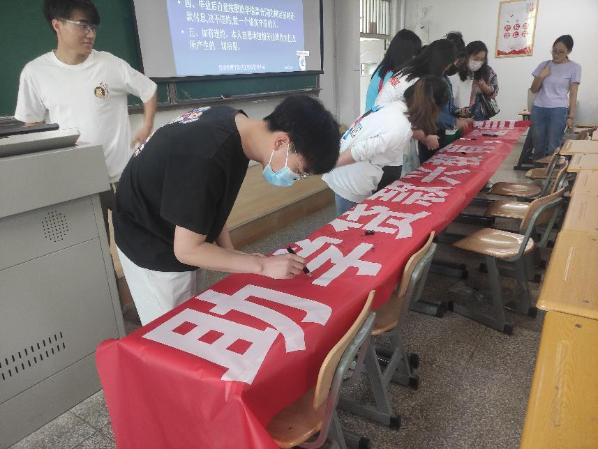 之后,貸款畢業(yè)生代表司玉蓉同學(xué)作了發(fā)言,閆寶龍同學(xué)帶領(lǐng)大家一起進(jìn)行了莊重的誠信宣誓儀式。經(jīng)濟(jì)管理學(xué)院畢業(yè)年級(jí)主任張晚霞老師倡導(dǎo)學(xué)生立誠信身、誠信做人、誠信踐事、誠信交友,做有責(zé)任、有擔(dān)當(dāng)、踐誠信的優(yōu)秀青年。馬麗老師宣讀了《國家開發(fā)銀行生源地信用助學(xué)貸款畢業(yè)生誠信承諾書》,介紹了生源地信用助學(xué)貸款的還款流程、還款須知等征信知識(shí)以及常見的征信問題,對(duì)如何維護(hù)個(gè)人信用、如何處理好個(gè)人征信中的疑難問題,給出了方法和建議。她建議同學(xué)們從細(xì)微處著手,積極維護(hù)個(gè)人良好的信用記錄。