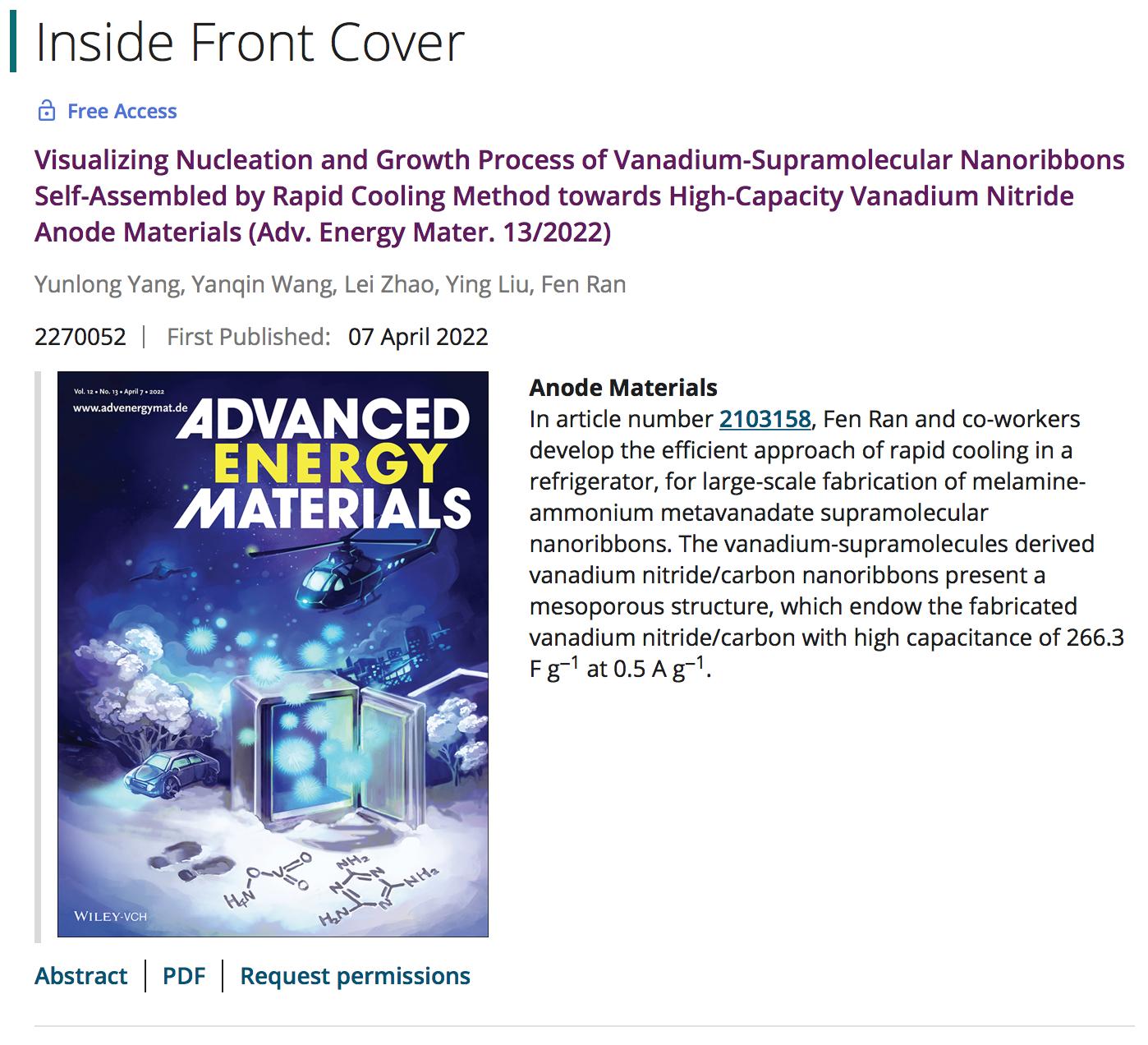 2022年4月,省部共建有色金屬先進(jìn)加工與再利用國(guó)家重點(diǎn)實(shí)驗(yàn)室和材料科學(xué)與工程學(xué)院冉奮教授在先進(jìn)氮化釩材料制備方面的最新科研成果以題為Nanoribbons Self-Assembled by Rapid Cooling Method towards High Capacity Vanadium Nitride Anode Materials發(fā)表于材料領(lǐng)域國(guó)際頂級(jí)學(xué)術(shù)期刊《Advanced Energy Materials》上,并被邀請(qǐng)作為當(dāng)期封面進(jìn)行出版與報(bào)道。該期刊為國(guó)際能源材料領(lǐng)域頂級(jí)期刊、中科院一區(qū)期刊,影響因子29.368,冉奮教授為論文的通訊作者,碩士生楊云龍為第一完成作者。