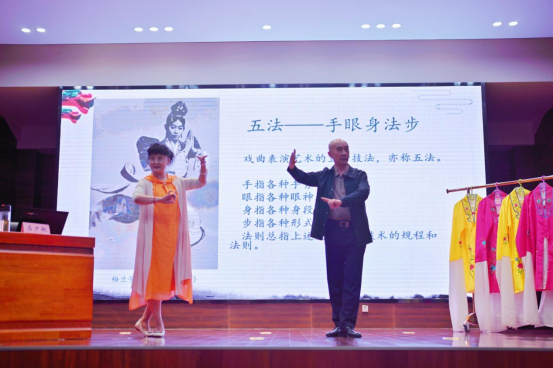 馬少敏教授結合梅派藝術特色,通過經典唱段演示與聲韻教學,解析京劇“唱、念、做、打”的程式化美學,強調“形神兼備”的表演精髓——不僅要精準掌握水袖翻飛、臺步輕盈的身段技巧,更要通過眼神、表情傳遞人物情感。同時,她向師生們展示了“云手”“圓場步”等基礎動作,以“手眼身法步”的協調統一為例,闡釋京劇如何以虛擬化動作展現“三五步行遍天下,六七人百萬雄兵”的舞臺意境。