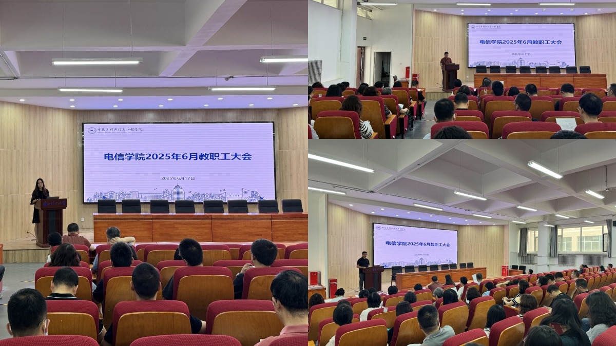 2025-06-19為統(tǒng)一思想、凝聚共識,進(jìn)一步推動(dòng)學(xué)院重點(diǎn)工作落地見效,6月17日下午,電信學(xué)院召開全體教職工大會。學(xué)院領(lǐng)導(dǎo)班子成員及全體教職工參會。