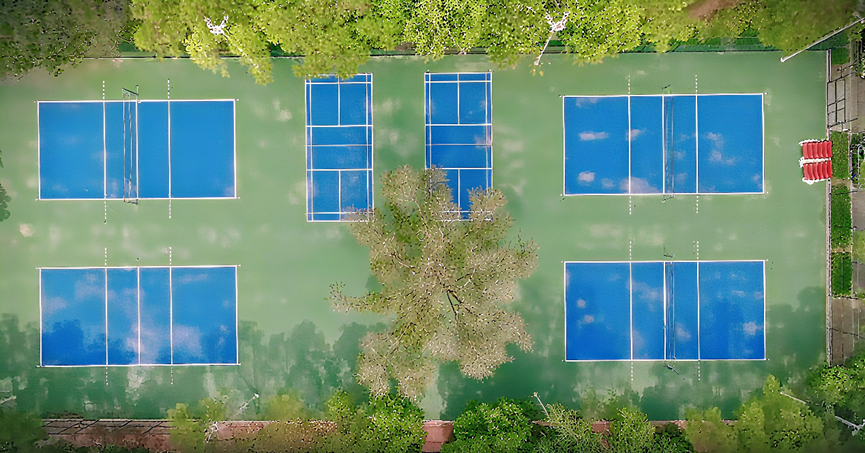 俯瞰之下,整治后的場(chǎng)地規(guī)整如矩,初秋的陽(yáng)光灑在硅PU面層上,綠色與湛藍(lán)交織出柔和光澤;四片標(biāo)準(zhǔn)排球場(chǎng)并肩鋪展,兩片羽毛球場(chǎng)地被巧妙嵌入其間,線條利落,互不干擾;4米高的浸塑圍網(wǎng)環(huán)繞四周,墨綠色調(diào)與樓宇、行道樹(shù)相映成趣,既開(kāi)闊視野,又確保安全;田徑場(chǎng)側(cè)新開(kāi)人行便門(mén),徑直通向13號(hào)學(xué)生公寓,師生往來(lái)更為便捷;長(zhǎng)軸之上,8座高桿燈對(duì)稱而立,夜間照度均勻,智能模塊可按區(qū)域、時(shí)段調(diào)光,在保障使用的同時(shí)實(shí)現(xiàn)節(jié)能;10組塑木長(zhǎng)凳在林蔭下均勻排布,休憩之所與景觀節(jié)點(diǎn)自然融為一體。