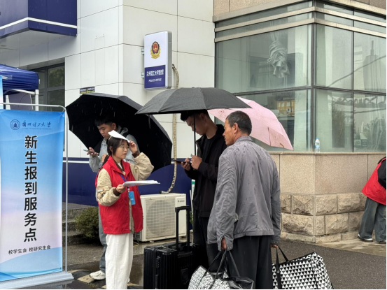 雨中守望,筑起暖心“避風港”。面對持續的降雨,校學生會和研究生會在迎新點及人流密集區域搭建了多處防雨帳篷服務點。這些帳篷不僅為匆忙報到的學子和長途跋涉的家長提供了遮風避雨的等候區,更成為了臨時的“暖心服務站”。志愿者們守候在此,一句“同學,需要雨衣嗎?”“家長,您先在這里歇歇腳”的貼心問候,瞬間驅散了秋雨的涼意,傳遞出蘭理工大家庭的第一份溫暖。