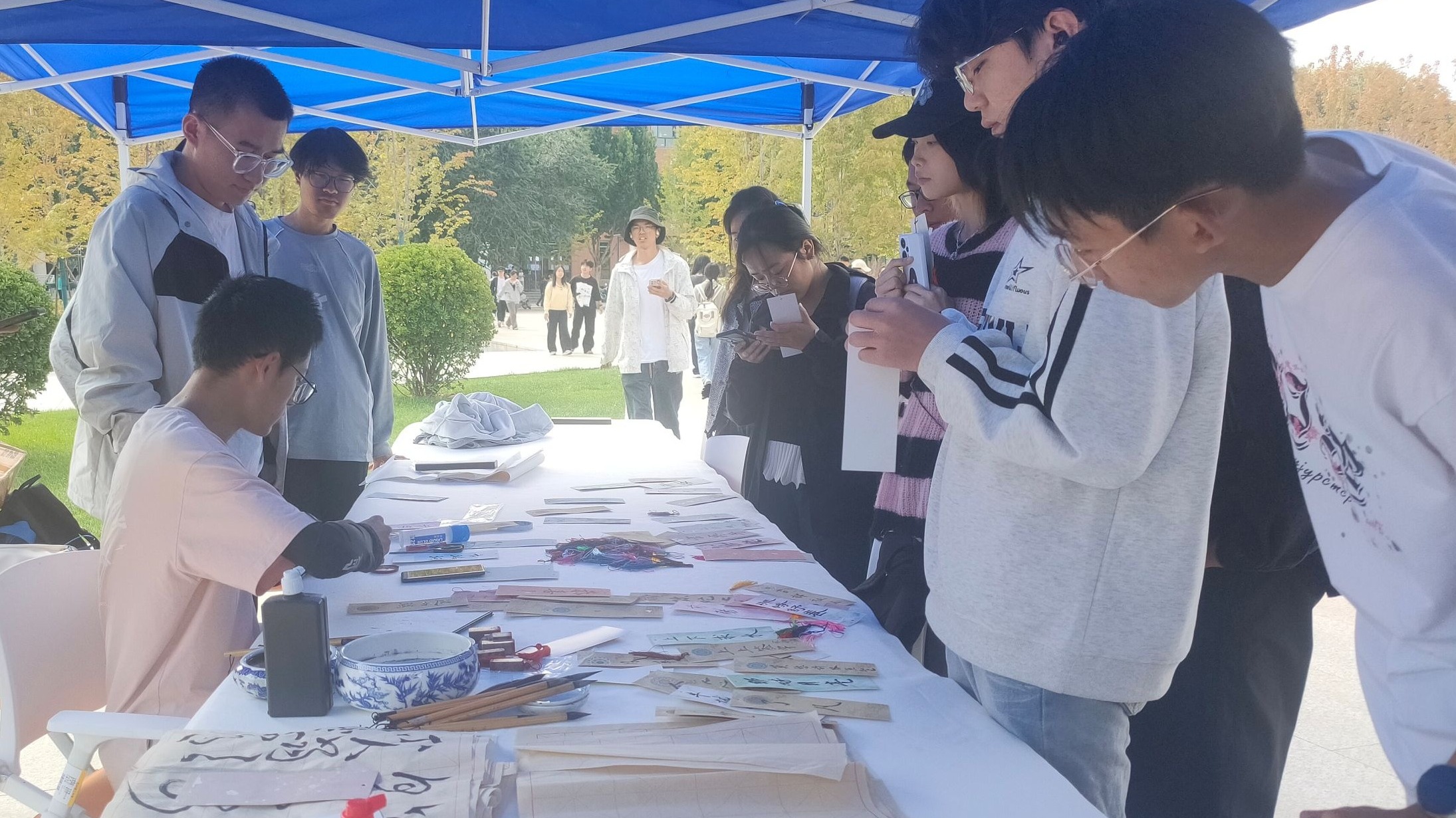 墨研月書畫協會以筆為劍、以紙為疆,將對祖國76華誕的祝福融入書法創作之中,用筆墨丹青書寫愛國情懷,并在活動之余開展了書法書簽定制小活動,同學們排隊等候專屬書簽,在書簽上寫下對祖國最深情的祝愿與對親朋最真摯的祝福。墨香與歡笑交織間,喜迎雙節的濃厚氛圍在校園內悄然傳遞。