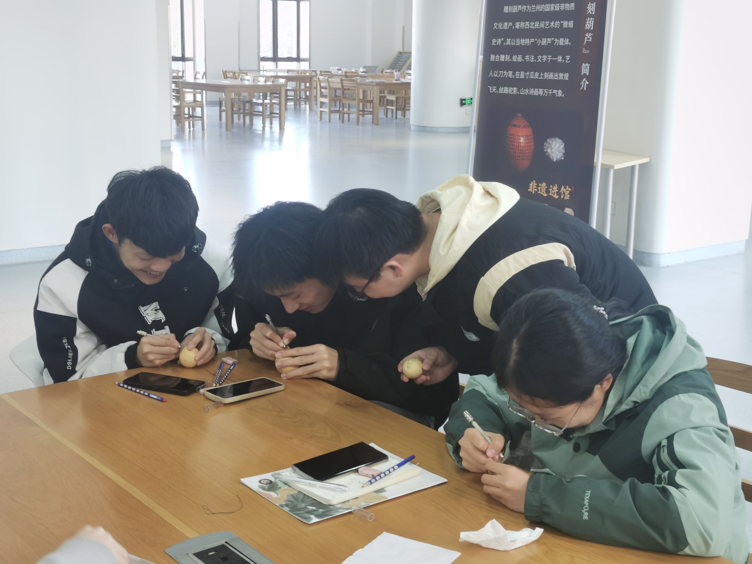 沉浸體驗,一刀一刻見匠心。實踐環(huán)節(jié),在非遺傳承人阮老師悉心指導(dǎo)下,學(xué)生們開啟了一場從選材、構(gòu)圖到雕刻的創(chuàng)作之旅。在現(xiàn)場刻刀與葫蘆碰撞的旋律中,參與者們或臨摹甘肅彩陶紋樣,或描繪植物山水,甚至將哪吒、孫悟空等潮流元素融入設(shè)計,為傳統(tǒng)技藝注入新的活力。